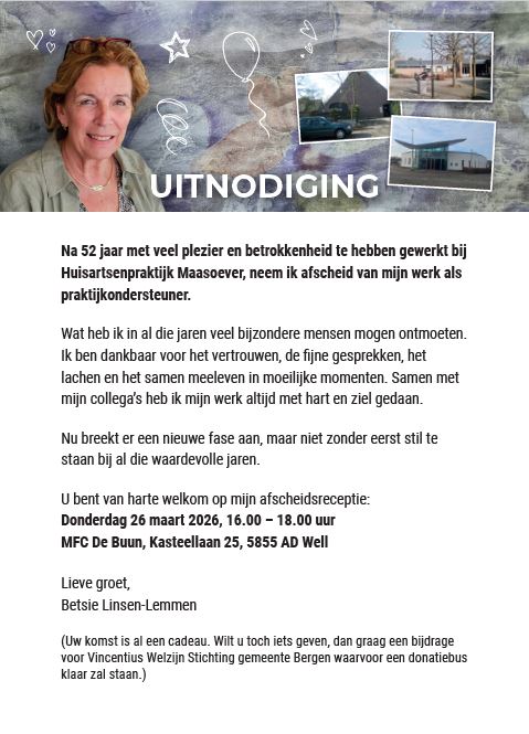Wij nemen enkel nog patiënten aan uit Wanssum, Meerlo en binnen de gemeente Bergen. We doen dit omdat we de zorg op grotere afstand niet kunnen garanderen.
